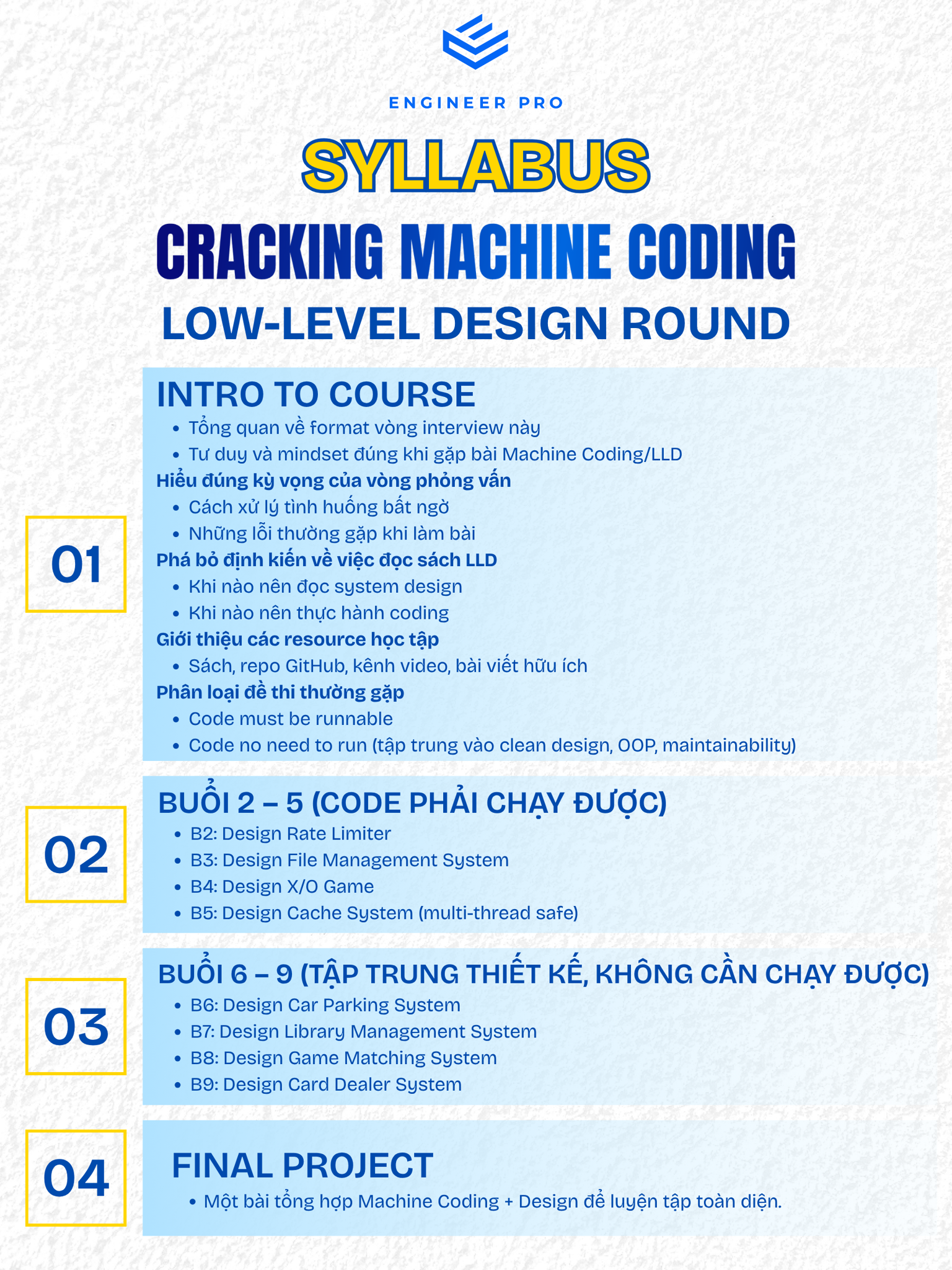 Khóa học "Cracking Machine Coding / Low-Level Design Round" tại Engineer Pro được xây dựng dành riêng cho những ứng viên đã có nền tảng về DSA và CS Fundamentals, muốn trang bị kỹ năng giải quyết các bài toán thực tiễn để vượt qua vòng phỏng vấn quan trọng này tại các công ty lớn trong và ngoài nước.